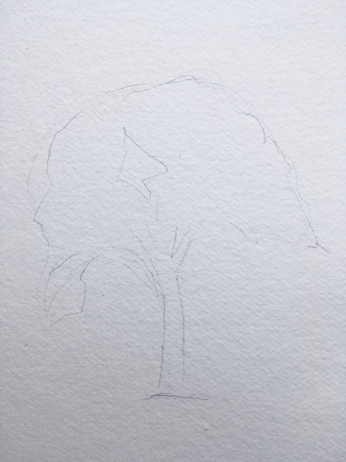 I began this painting by sketching a simple outline of the tree. No need to be too precise here; in fact, as with all stages of watercolour paintings, the more open you are to changes and mistakes along the way, the better the outcome will be.